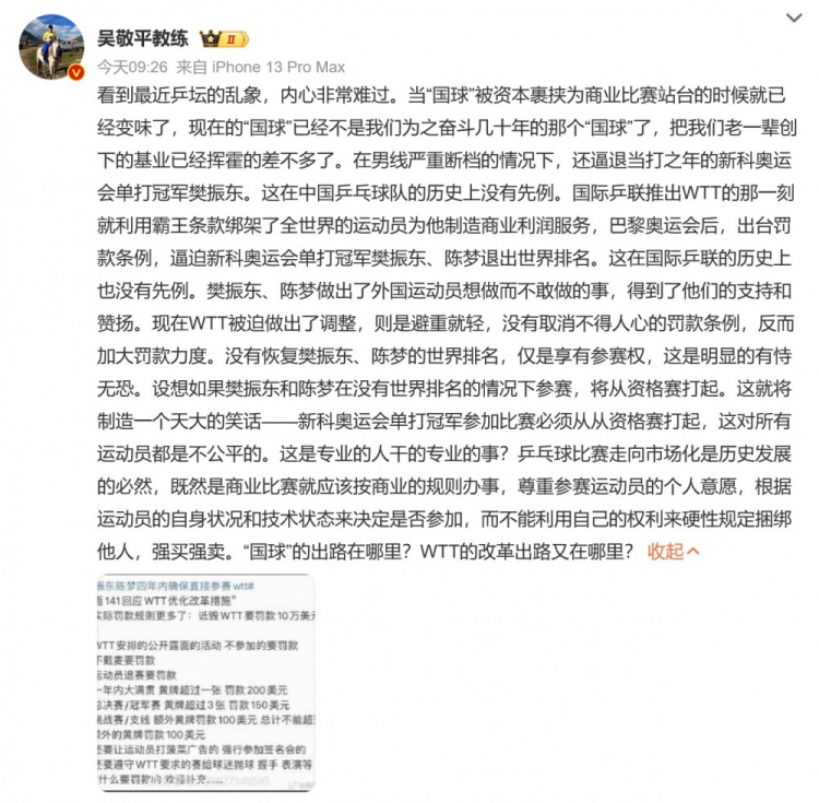 02月16日讯 2月15日,国乒功勋教练吴敬平发博,直指近期发布进行赛制改革的WTT,认为国球被商业裹挟变味。